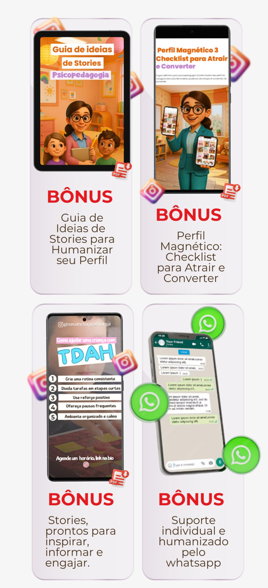 Ao visitar nossa página bônus, você garante um pack de figurinhas psicopedagógicas para usar nos seus Stories e WhatsApp. ✨