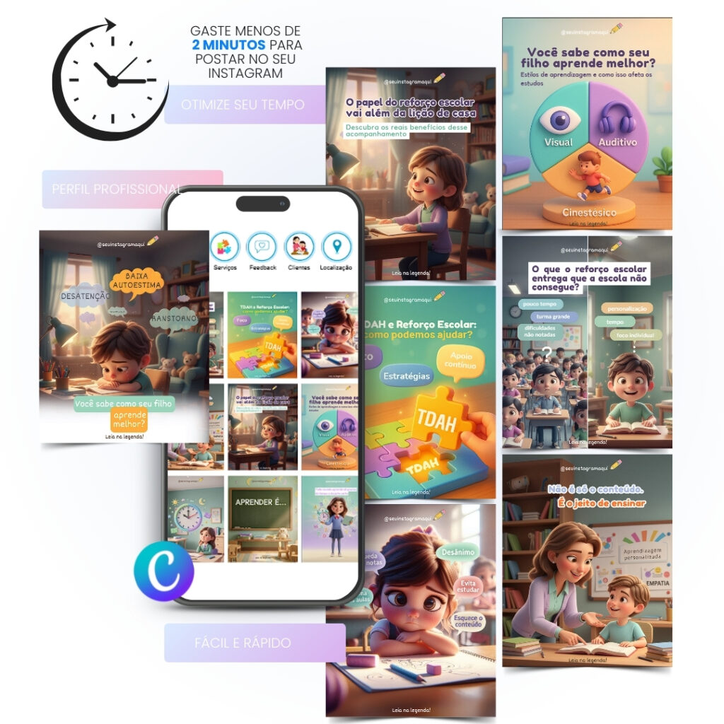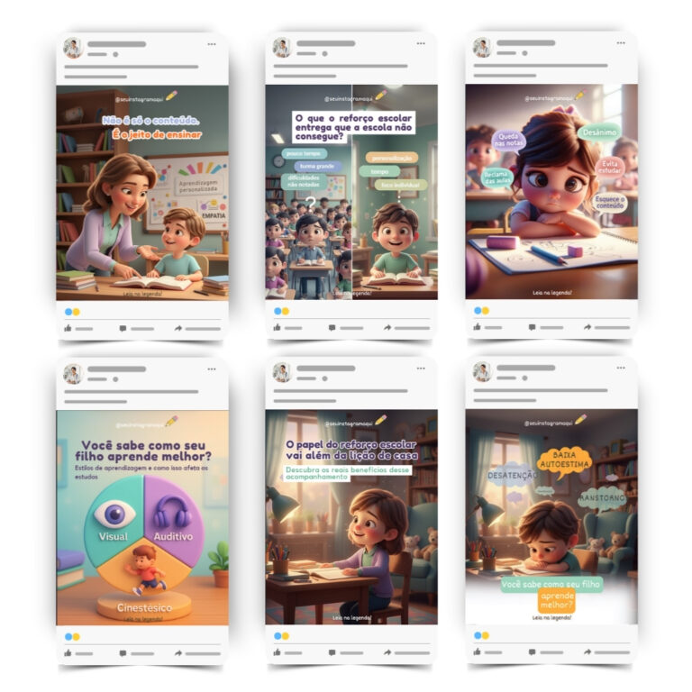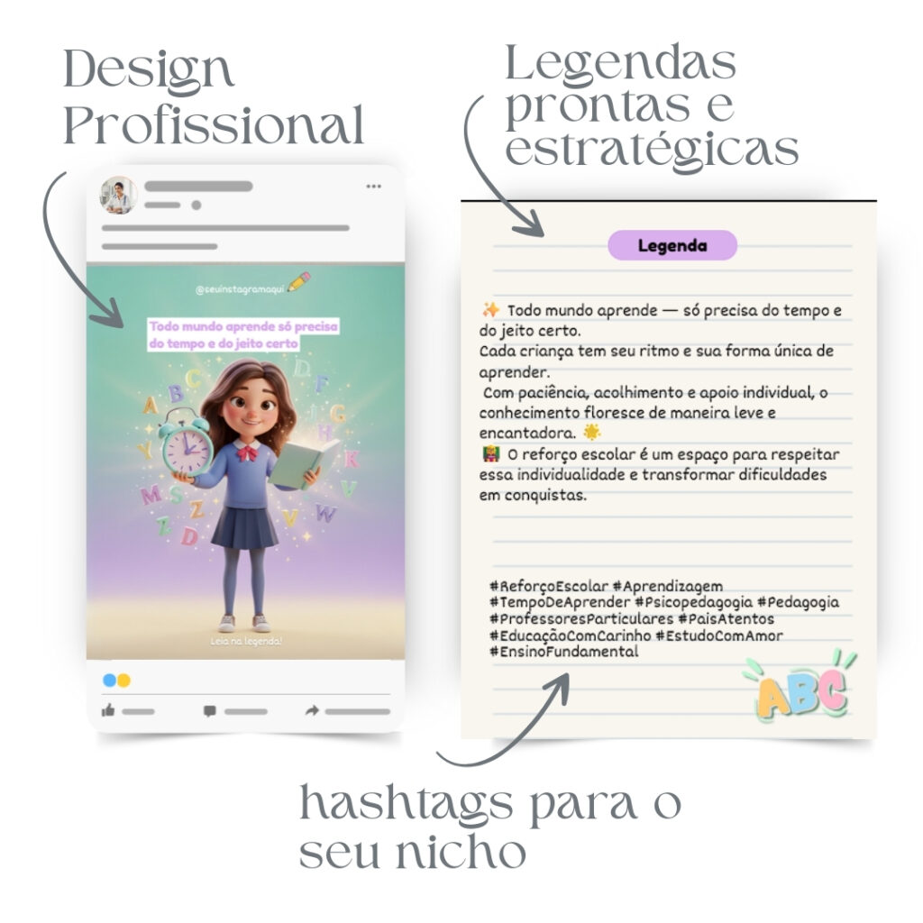 todos os posts já vêm com legendas prontas, conteúdo direcionado e hashtags pensadas para atrair famílias e alunos interessados nos seus serviços. 💜