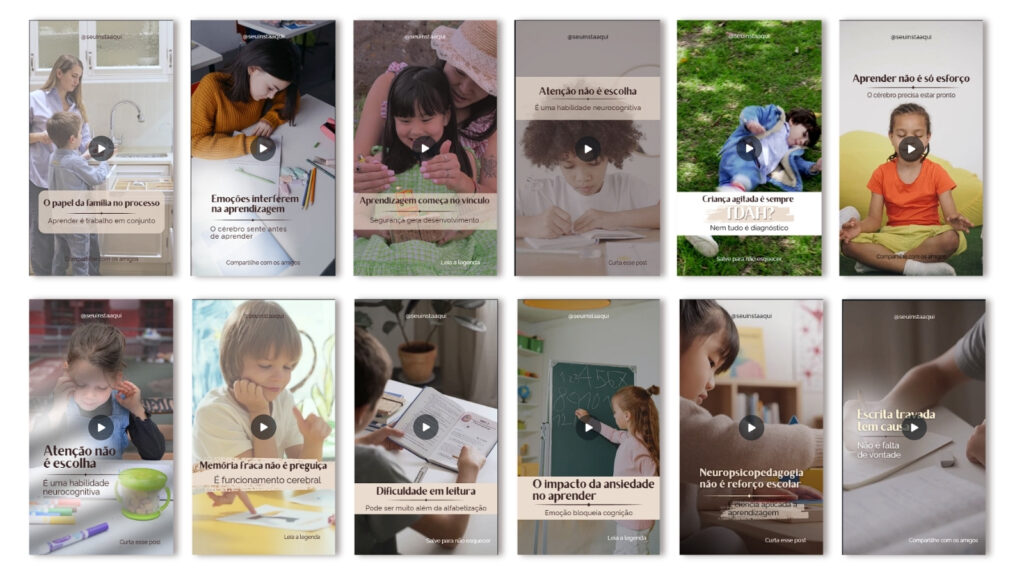 Escolha os Reels, faça os ajustes que desejar e publique no seu ritmo. O material permite constância na comunicação sem a necessidade de gravar vídeos ou aparecer.